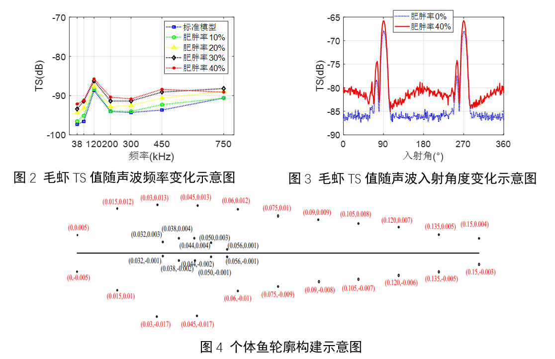 通过将海洋生物体简化为沿中心轴线的多个连续圆柱体微元,建立了毛虾类、水母类、小型鱼类等单体生物声学目标强度模型,获取入射频率、入射角、体长、体形、物种属性等对海洋生物声学目标强度的影响;基于海洋生物群落分布特点,建立了海洋生物群落声学散射回波模型;获取了海洋生物自身声学特性、数量、不同分布及声学信号对海洋生物声学目标回波影响。理论建模分析如图2、图3、图4所示。