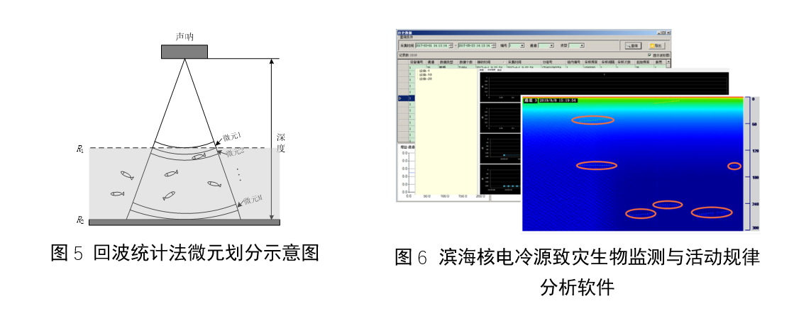 针对典型致灾海洋生物特点,综合运用回波积分法和回波统计法,改进了核电冷源致灾海洋生物资源量声学评估方法。回波统计法利用回波信号的一阶矩和二阶矩统计特性估计海洋生物密度,它主要优点是只需利用回波信号的相对声学量,并且无需海洋生物的目标强度作为先验信息,适用于定点监测。回波积分法利用海洋生物回波信号的绝对声学量和单体的目标强度;通过海洋生物后向散射能量与海洋生物数量之间的线性关系实现海洋生物密度估计,适用于走航监测。研究人员基于海洋生物声学信号处理算法,研发了滨海核电冷源致灾生物监测与活动规律分析软件,软件具有原始数据目标强度校准、自动识别并降低背景及间歇性噪声、目标特征提取识别分类及跟踪、量化分析海洋生物资源时空变化等功能。评估算法及软件如图5、图6所示。