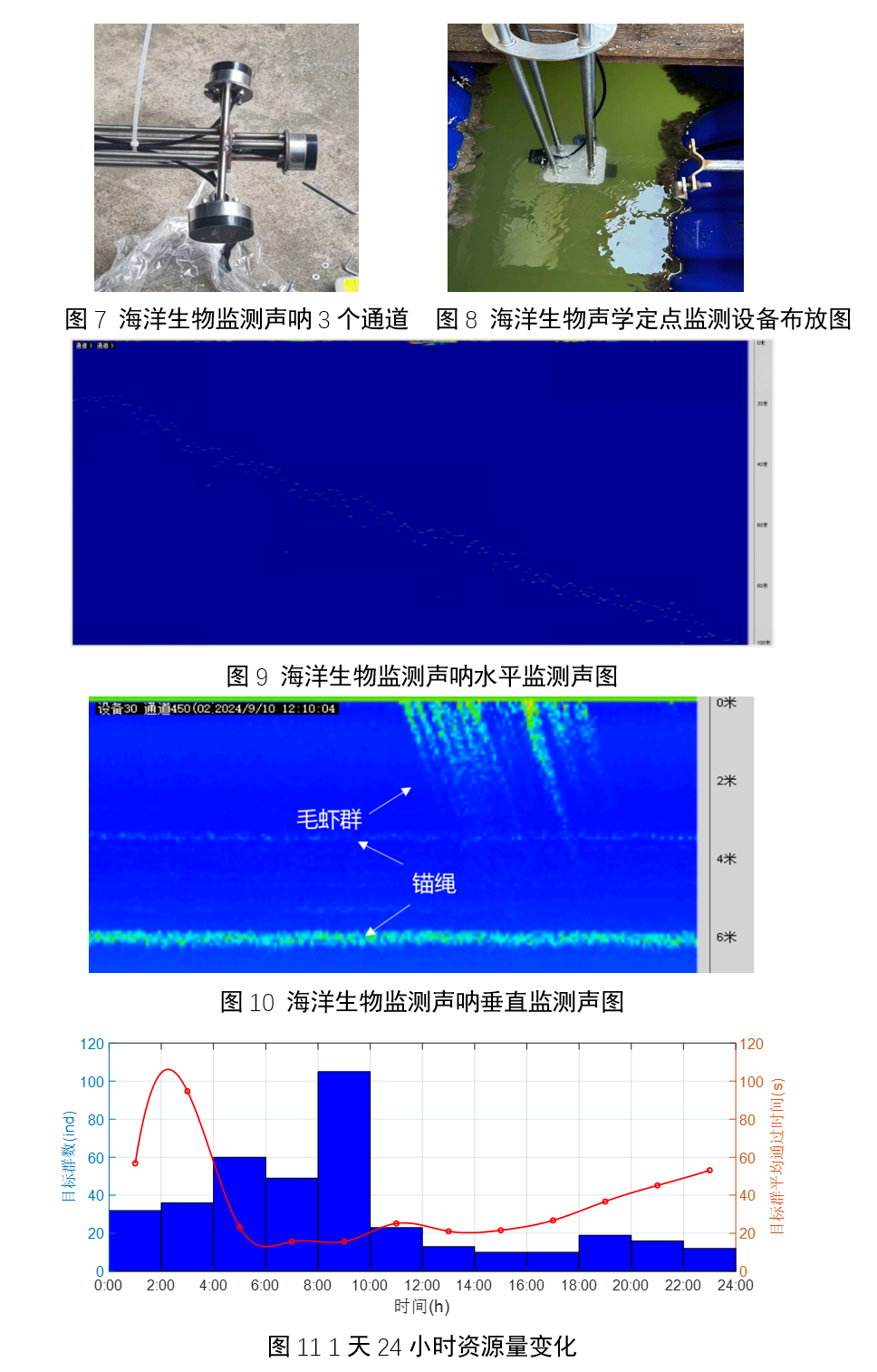 滨海核电站冷源取水口海洋生物声学定点监测方案中,海洋生物监测声呐安装在浮标底部,共3个通道,1个450kHz换能器垂直向下探测,1个200kHz换能器和1个450kHz换能器水平探测,每个通道都会输出海洋生物资源量结果。一个核电站取水口通常布放多套设备。声学定点监测结果主要输出:时空资源密度分布、海洋生物分类、回波信息、声图等。海洋生物监测声呐目前已在多个核电站24小时连续运行,最长时间已达2年以上。设备布放如图7、图8所示;监测图像如图9、图10所示。1天24小时资源量变化如图11所示,2:00-4:00通过的生物群平均通过时间最长,为94.72秒。8:00-10:00通过的生物群数最多,为105个。说明凌晨通过换能器的生物群较集中,上午通过换能器的生物群个数较多,但每个群包含目标数量较少。