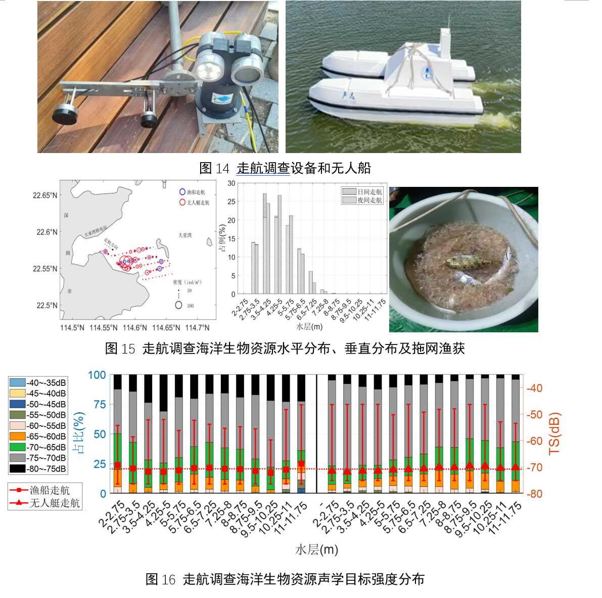 为了准确掌握核电站取水口附近海域致灾海洋生物分布,研究人员以渔船和无人船为调查平台,采用双频海洋生物监测声呐开展了多次走航调查。调查设备和无人船如图14所示。走航过程中声呐探测到了大量目标,波形、声图变化明显。调查结果显示,调查海域夜间资源量大于日间资源量,生物类型主要为体型较小、回波较弱的生物,调查结果与拖网数据吻合。部分数据分析结果如图15、图16所示。
