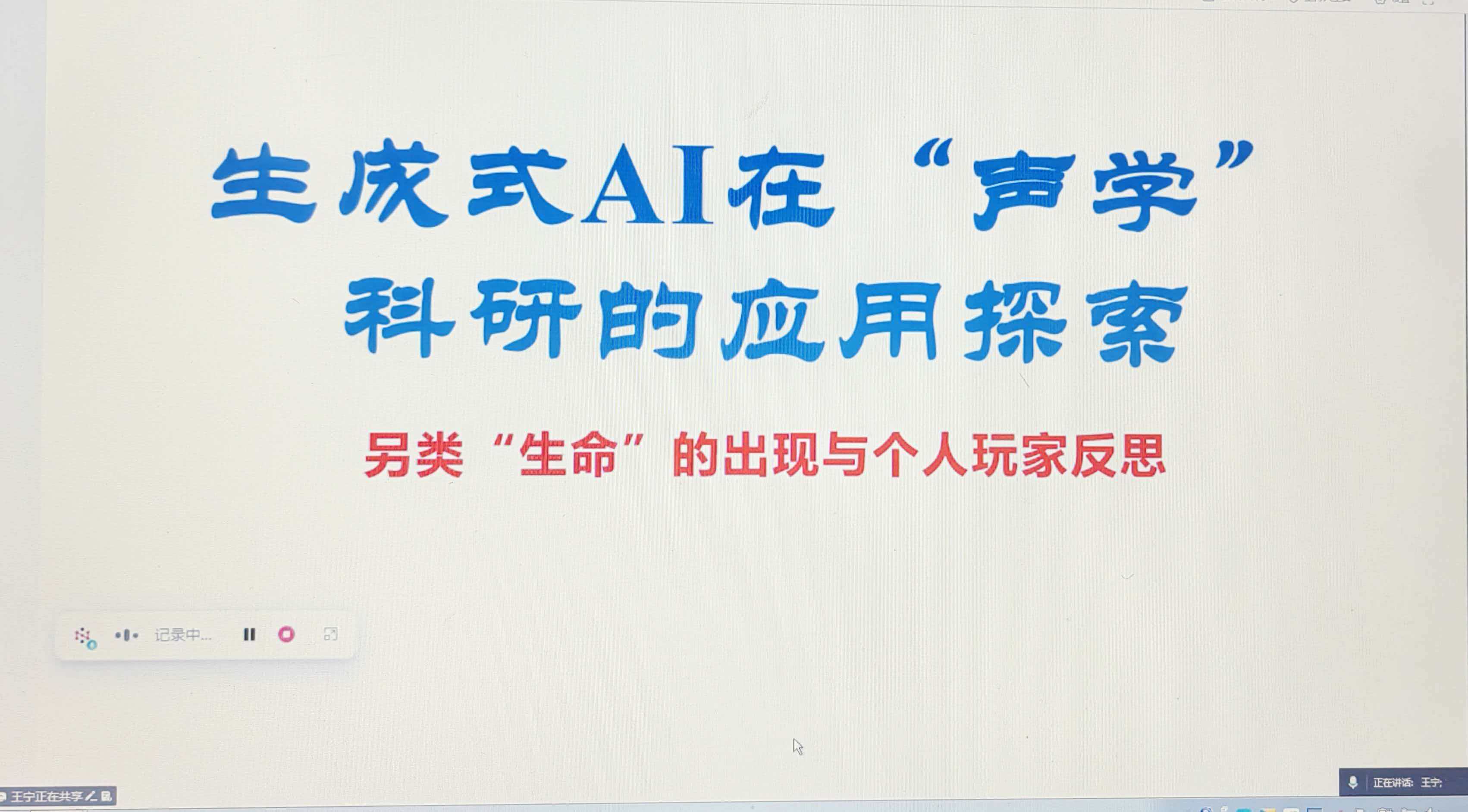 王宁教授作题为《生成式AI在声学科研上的应用探讨》的报告。报告以水下目标探测与识别中的问题为案例,强调生成式AI 依赖于研究者的有效提示,要通过物理知识约束,进一步细化问题模型,用正确的数学描述逐步引导,达到有效利用AI综合能力的目的;报告还对未来5-10年,该技术在声学基础研究与工程应用中的发展前景进行了展望。